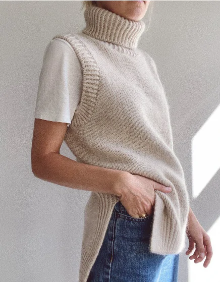Тёплый, практичный жилет с высоким воротником и удлинённой спинкой, связанный спицами сверху вниз с описанием от Petiteknit.