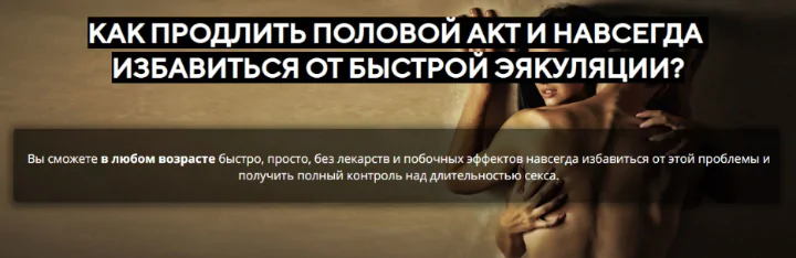 Его цель – помочь Вам оперативно скорректировать проблему ранней эякуляции «здесь и сейчас». Мы дадим Вам несколько рабочих комбинаций из наружных пролонгирующих средств и определенных техник, чтобы Вы могли гарантированно уже в этот вечер продлить свой половой акт на 5-10 минут.