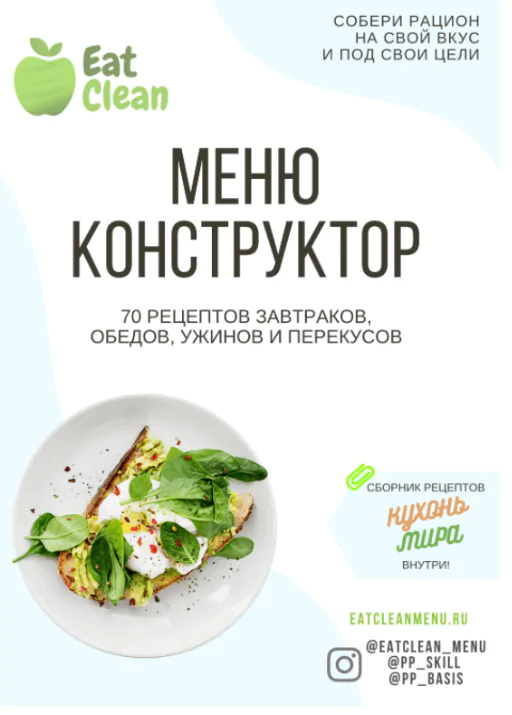Меню-конструктор представляет собой набор рецептов, распределённых по приемам пищи (завтрак,обед,ужин, перекус). Для тех, кому важны калории и БЖУ, к каждому приему пищи будут подписаны КБЖУ.