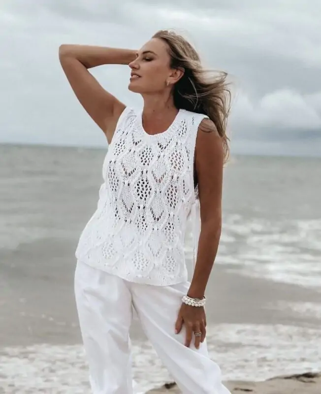 Топ вяжется снизу вверх раздельными деталями, боковые швы отсутствуют и топ фиксируется длинными завязками, при желании вы можете выполнить боковые швы( в мк описано 2 варианта).